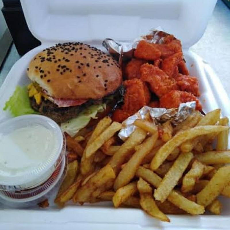 Hamburguesa clásica, boneless personal y papas a la francesa con aderezo ranch.