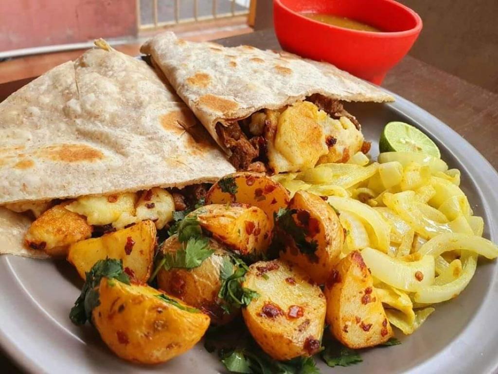 Con carne de lenteja con avena o chicharo con quinoa y arroz, se acompaña con papas red y chiles en conserva.