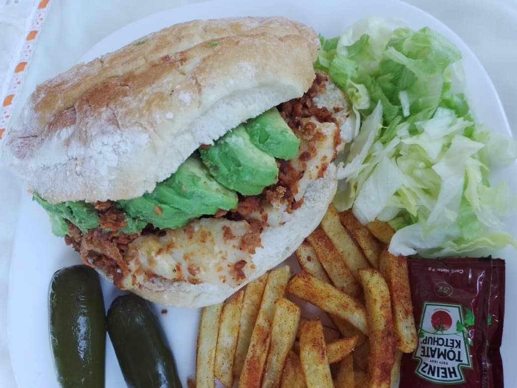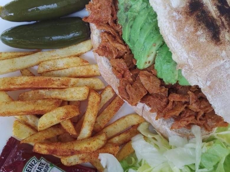 Torta Vegana de carne Adobada, aguacate, aderezo vegano, lechuga z papas red, y chiles en conserva