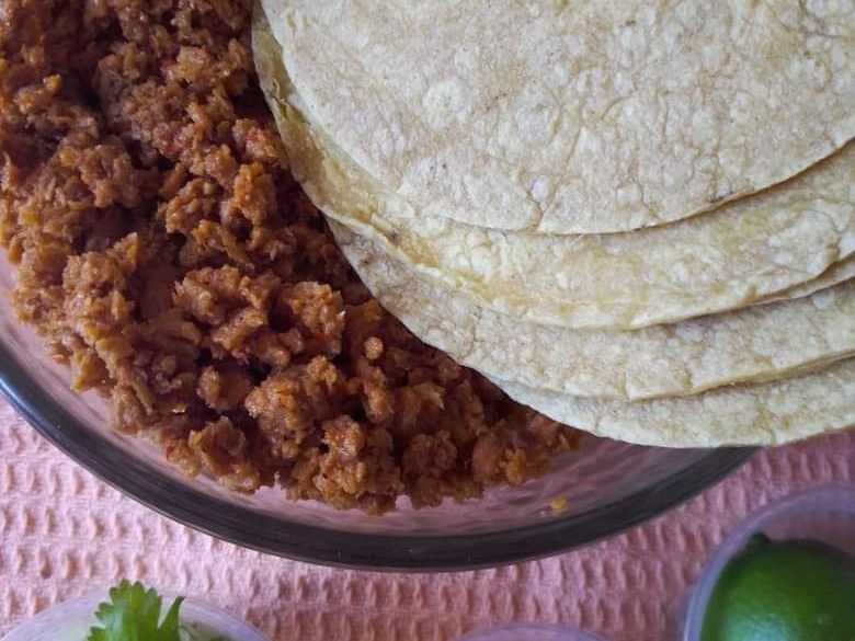 1\2 litro de Chorizo de soya, tortillas de maíz, salsa, cebolla con cilantro y limon