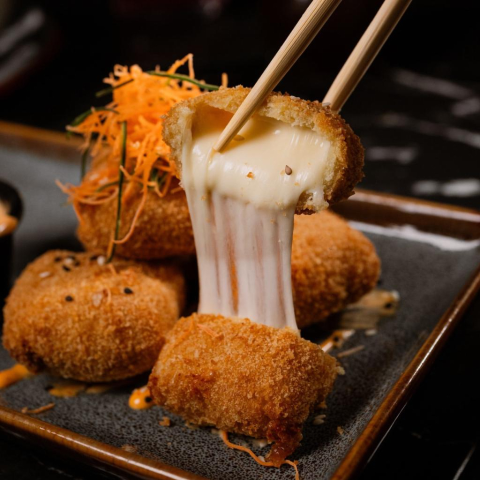 Arroz marinado, cangrejo frito, pasta de kanikama, fritura, ajonjoli, cebollin con siriacha, dorado por fuera, aguacate por dentro, salsa de anguila, aderezo de togarashi.