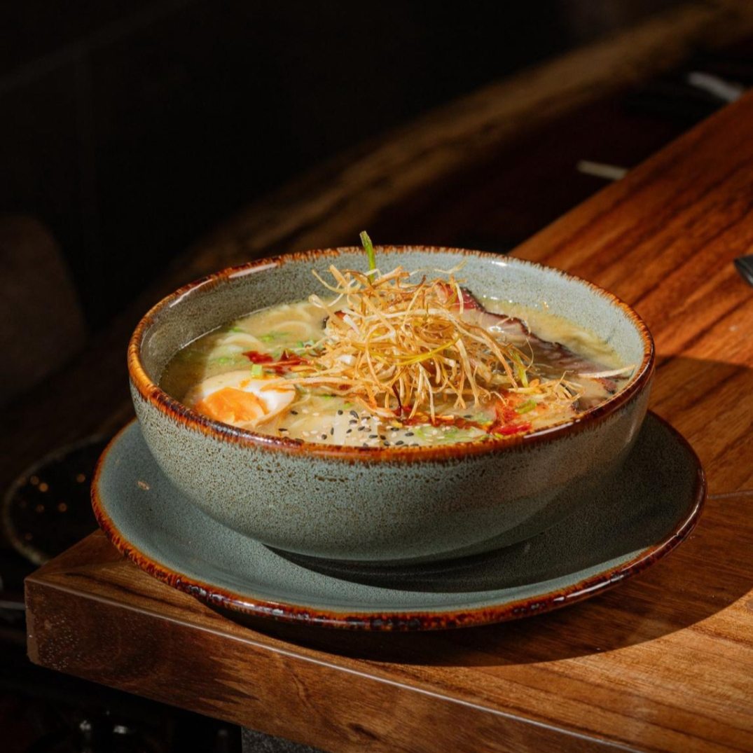 Noodles, curry, cebolla, panceta de cerdo, ajo frito, cebollin, huevo, salsa de chiles tatemados con bambu y ajonjoli tostado.
