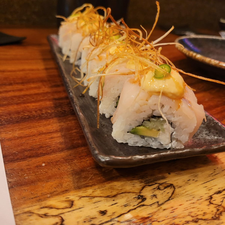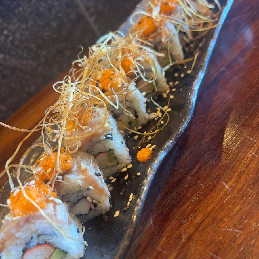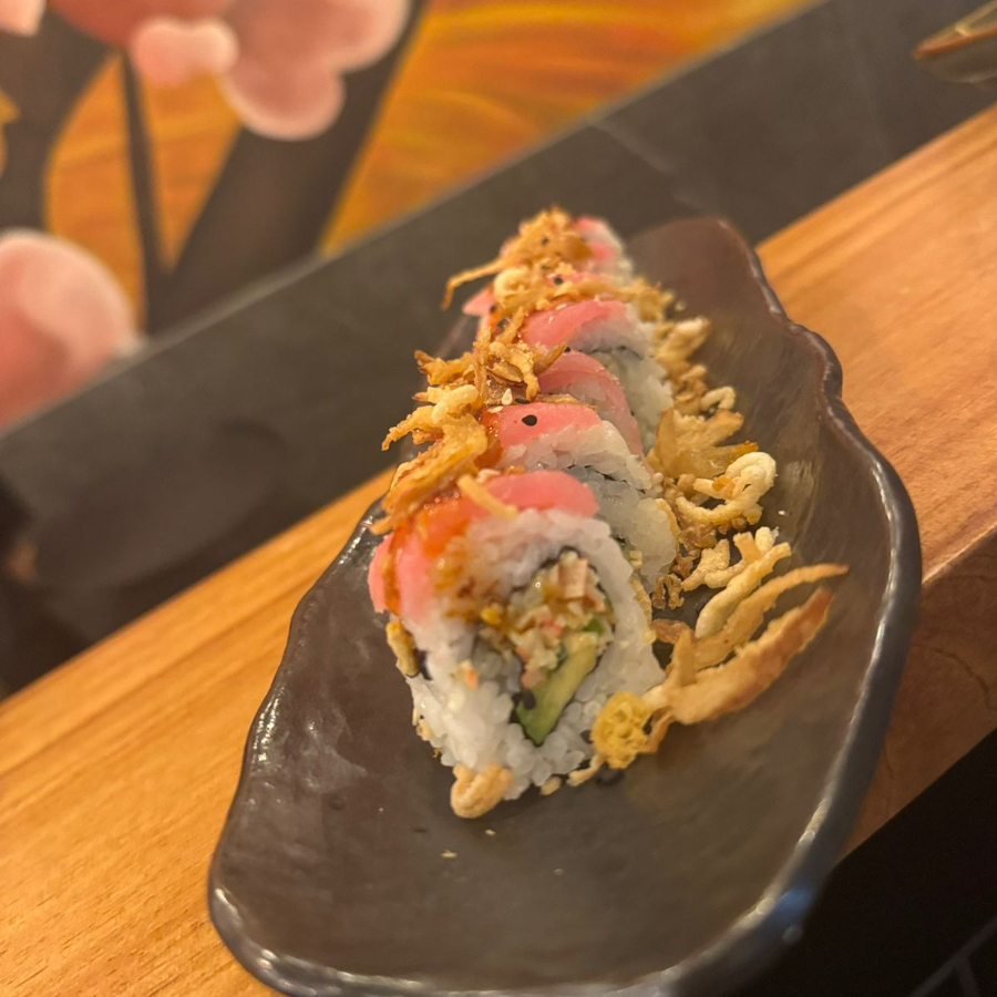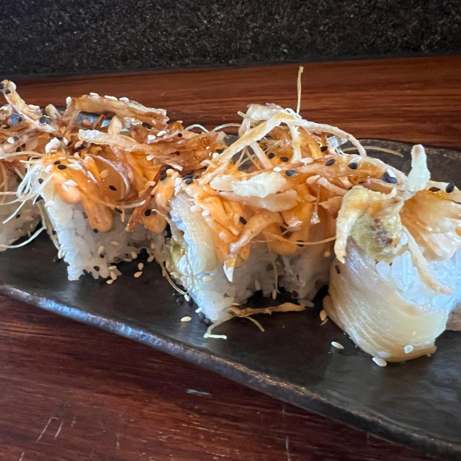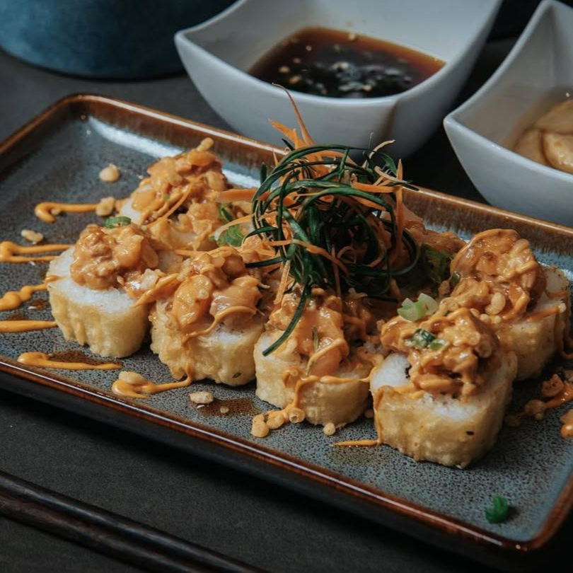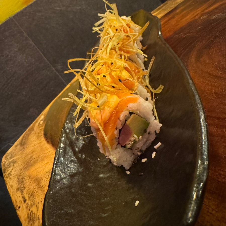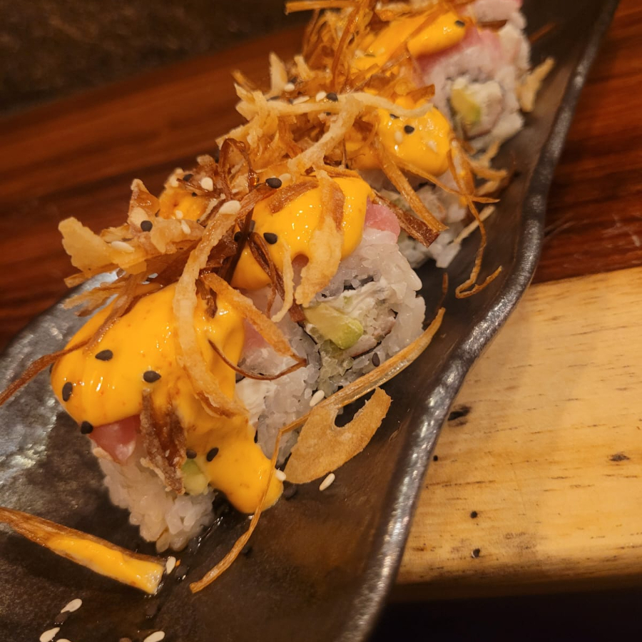 Arroz marinado, alga, hamachi aderezo de chie serrano tostado, aguacate, queso crema, fritura, salsa de anguila, aderezo, ajonjoli y poro frito.