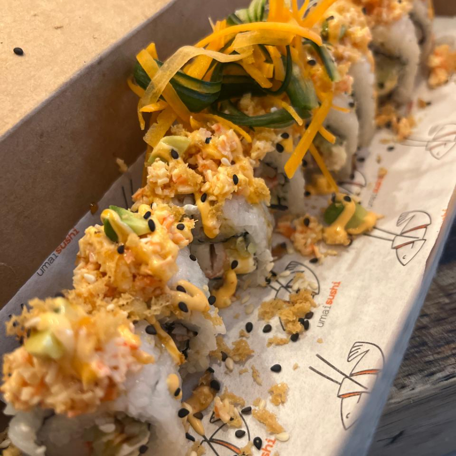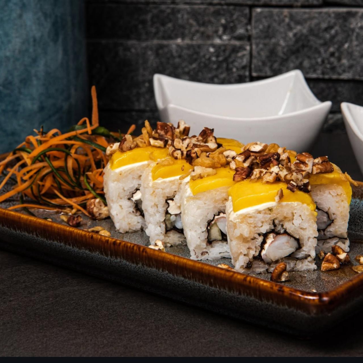 Arroz marinado, alga, camaron, mango, nuez caramelizada, pepino, queso crema, fritura, salsa de anguila y aderezo siriacha.