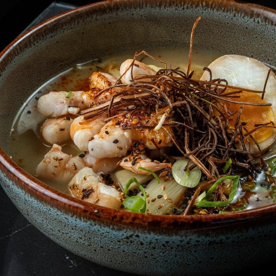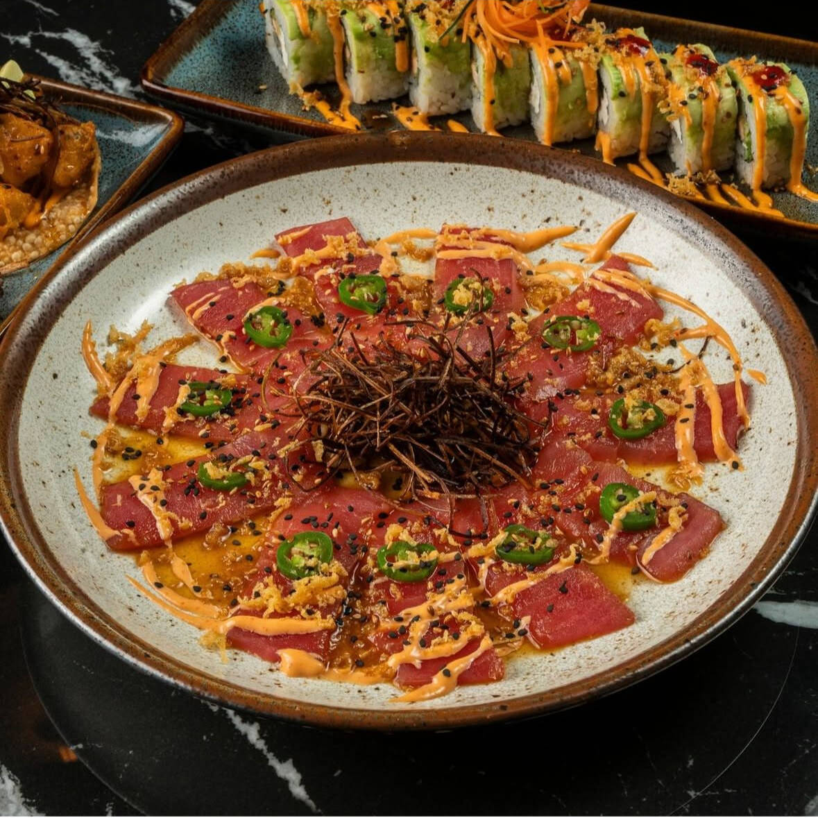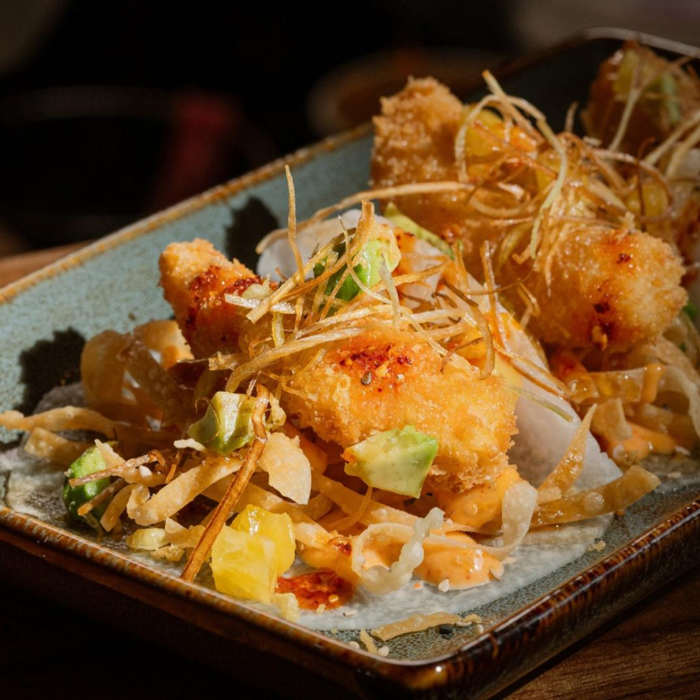 Atun, arroz marinado, alga, aderezo de togarashi, poro frito, kanikama, aguacate, fritura, ajo confitado con salsa macha, cebolla frita, aceite de ajonjoli.