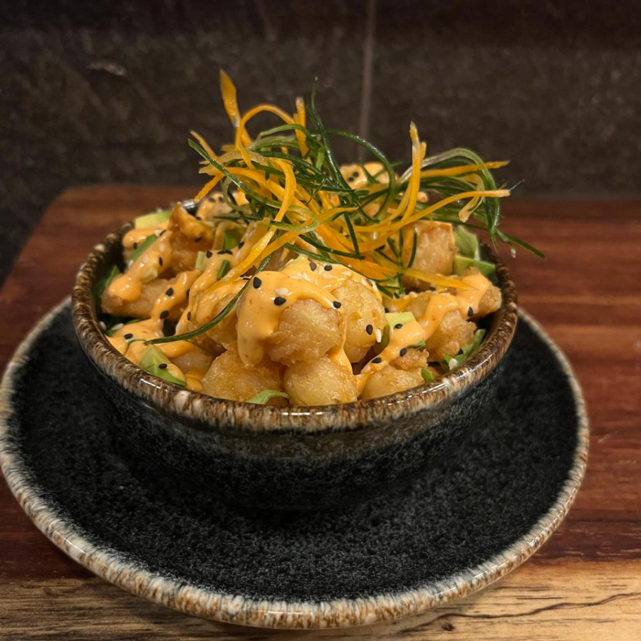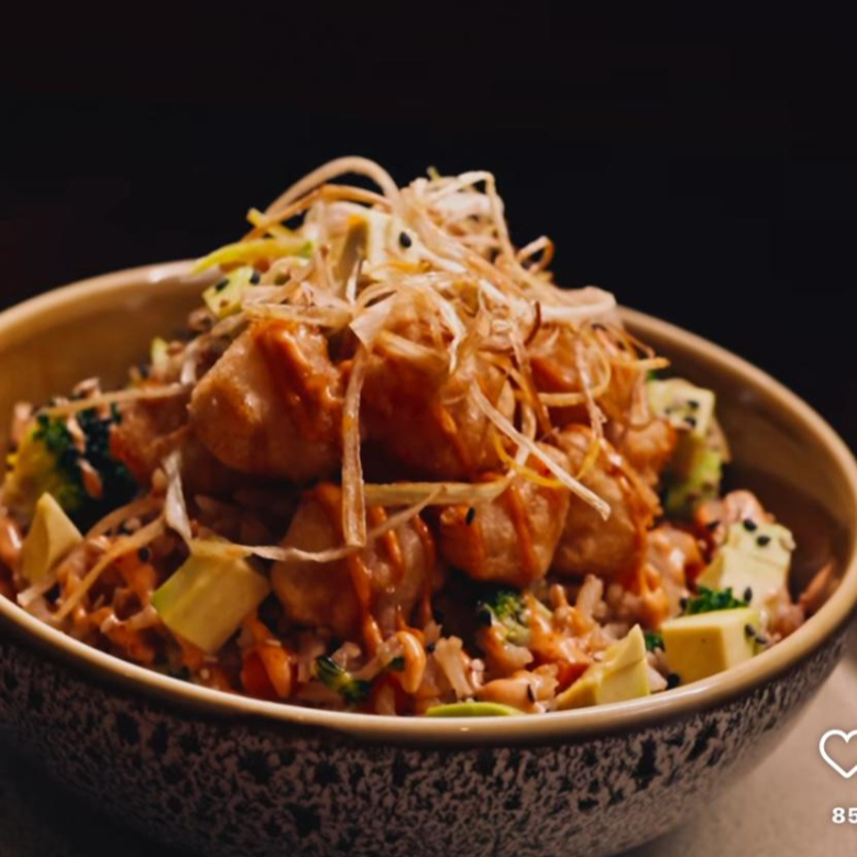 Arroz marinado, salmon fresco, aguacate, fritura, atun, cebollin, kanikama con siriacha, fritura de kanikama, aceite de ajonjoli.
