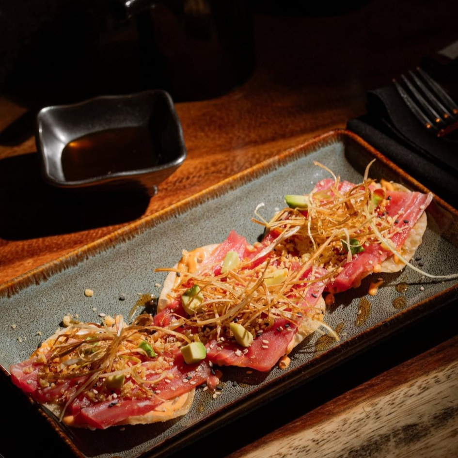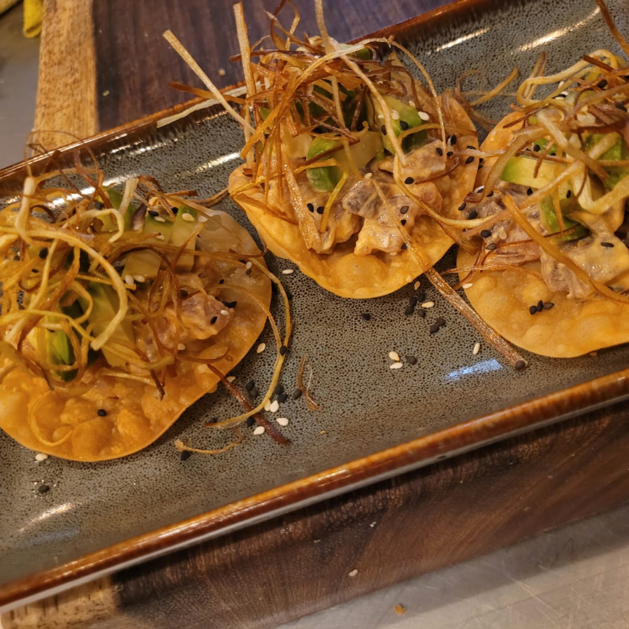 Wonton, aderezo de siriacha, atun marinado, poro frito, aguacate, salsa sesamo y fritura.