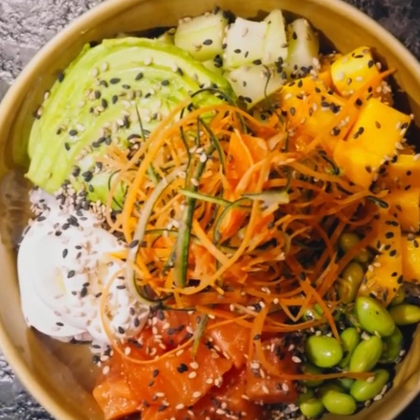 Arroz marinado, salmon fresco, aguacate, edamames, salsa macha, pepino, queso crema, ajonjoli, fritura, mango, poro frito, aderezo de siriacha y salsa de anguila.