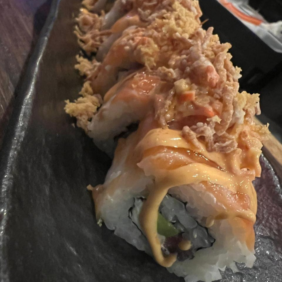 Arroz marinado, alga, queso crema, pepino, salmon fresco, aguacate, fritura, salsa de anguila y aderezo siriacha.
