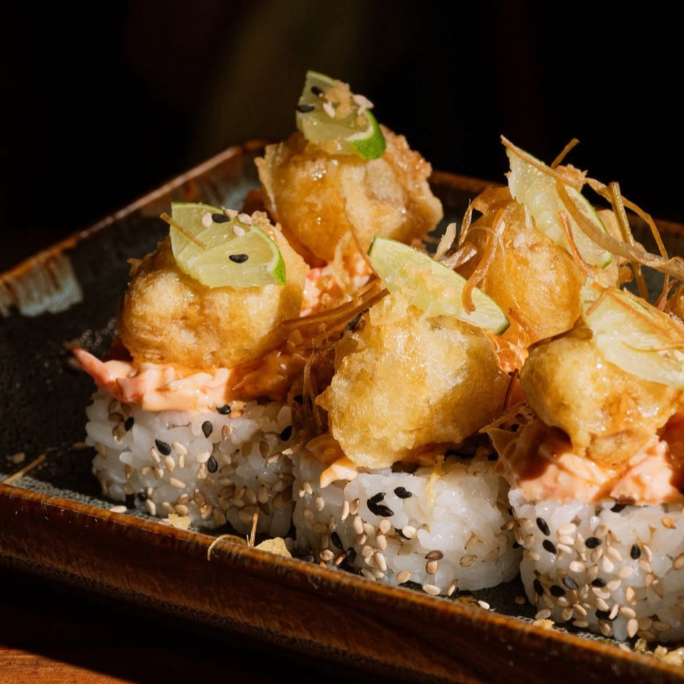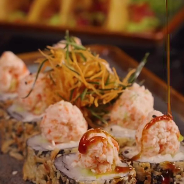 Anguila ahumada capeada, arroz marinado con ajonjoli, kanikama, pepino, queso crema, aderezo de chile morita limon, fritura, salsa de anguila y aderezo de siriacha.
