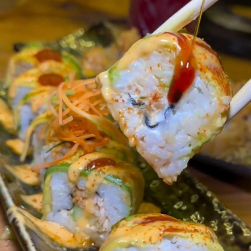 Arroz marinado, alga, atun, queso crema, pepino natural, aguacate, fritura, salsa de anguila y aderezo siriacha.