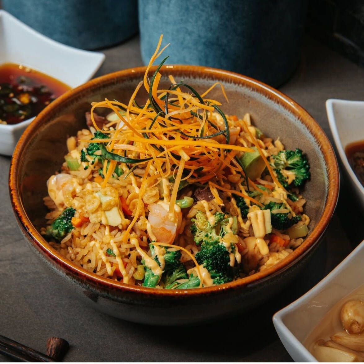 Arroz frito al curry, zanahoria, brocoli, apio, cebolla, soya, ajo, camaron, carne, pollo, salsa de anguila, fritura y aderezo siriacha.