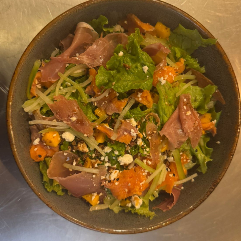 Ensalada organica con mango, pepino, queso de cabra, nueces caramelizadas, mirin, jamon serrano y salmon ahumado.