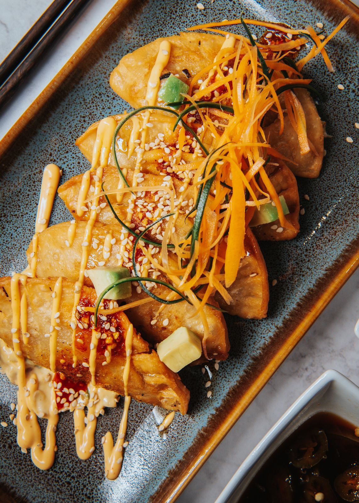 Gyozas fritas de cerdo con jengibre, salsa sesamo de chile de arbol, aguacate, aderezo spicy y salsa de anguila con ajonjoli. (5 pzas)