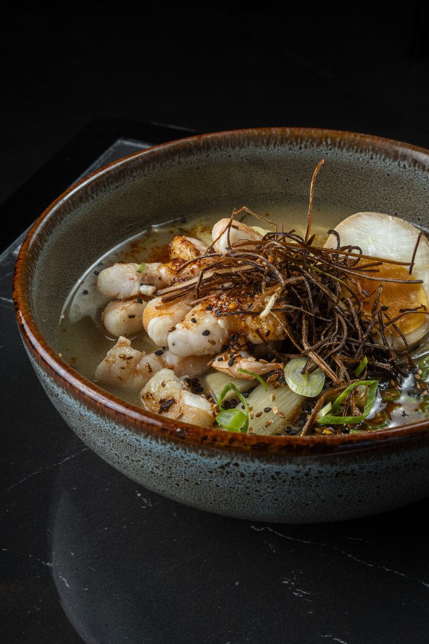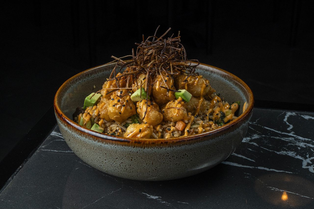 Atun, arroz marinado, alga, aderezo de togarashi, poro frito, kanikama, aguacate, fritura, ajo confitado con salsa macha, cebolla frita, aceite de ajonjoli.