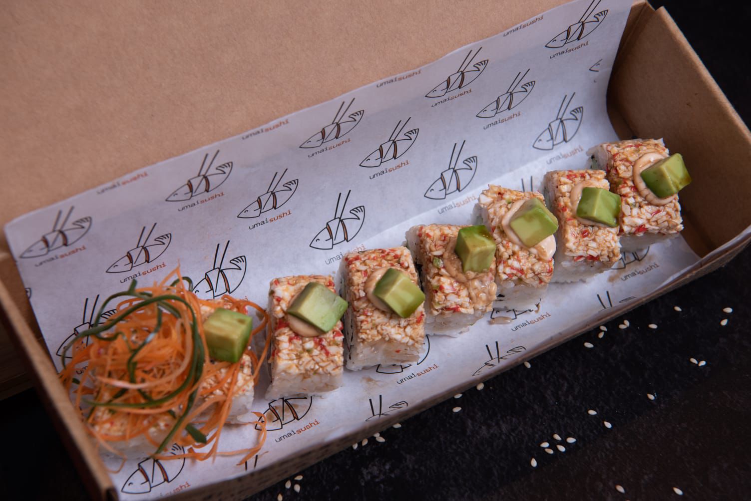 Arroz, alga, pepino, queso crema, aguacate, ajonjoli, salsa de anguila, aderezo de la casa, fritura, kanikama con aderezo siriacha.