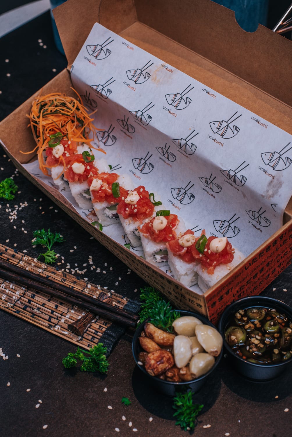 Arroz marinado, alga, queso crema, pepino, atun marinado fresco, aguacate, fritura, ajo confitado, ajonjoli tostado, salsa de anguila, aderezo de togarashi y aceite de ajonjoli.