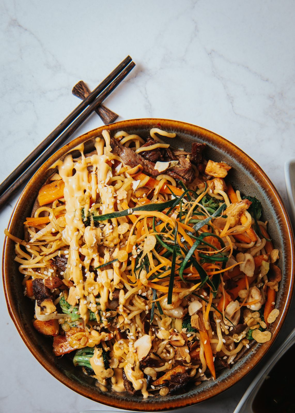 Arrachera, camaron, pollo, noodles, cebolla, calabaza, zanahoria, ajonjoli, soya, salsa sesamo, brocoli, col, almendras tostadas y aderezo de siriacha.