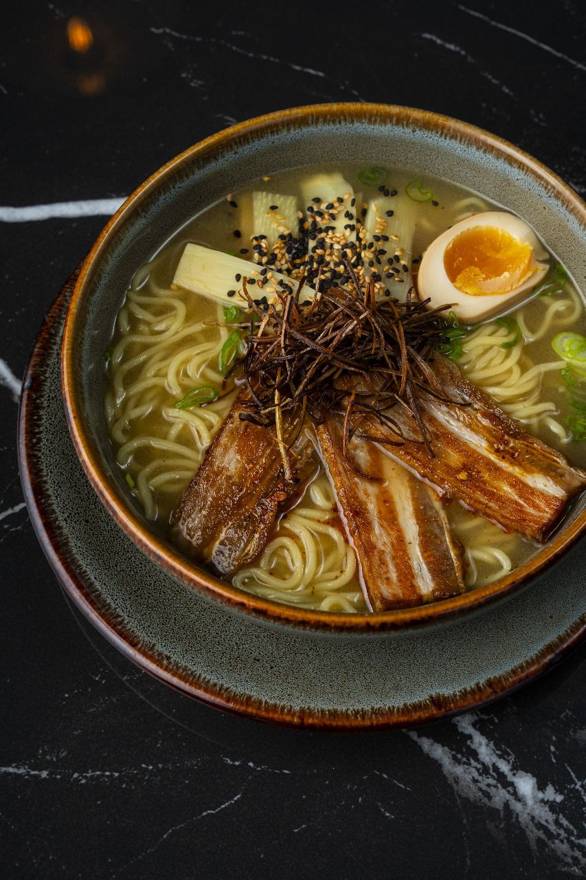 Noodles, curry, cebolla, panceta de cerdo, ajo frito, cebollin, huevo, salsa de chiles tatemados con bambu y ajonjoli tostado.