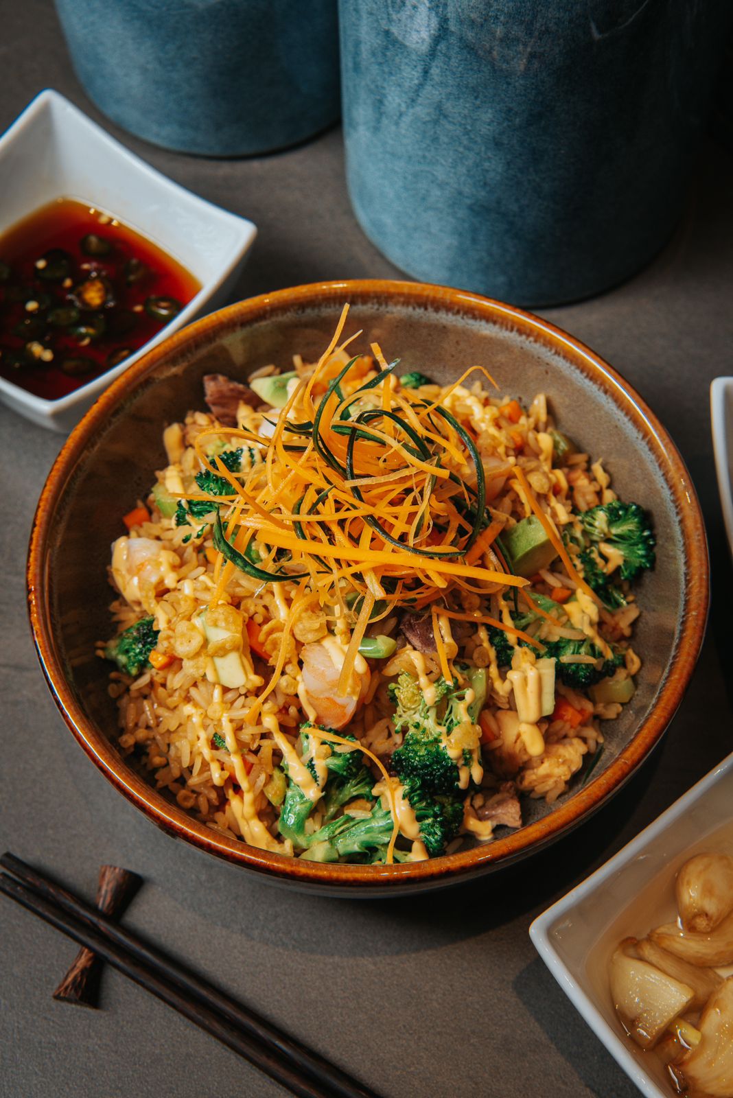 Arroz frito al curry, zanahoria, brocoli, apio, cebolla, soya, ajo, camaron, carne, pollo, salsa de anguila, fritura y aderezo siriacha.