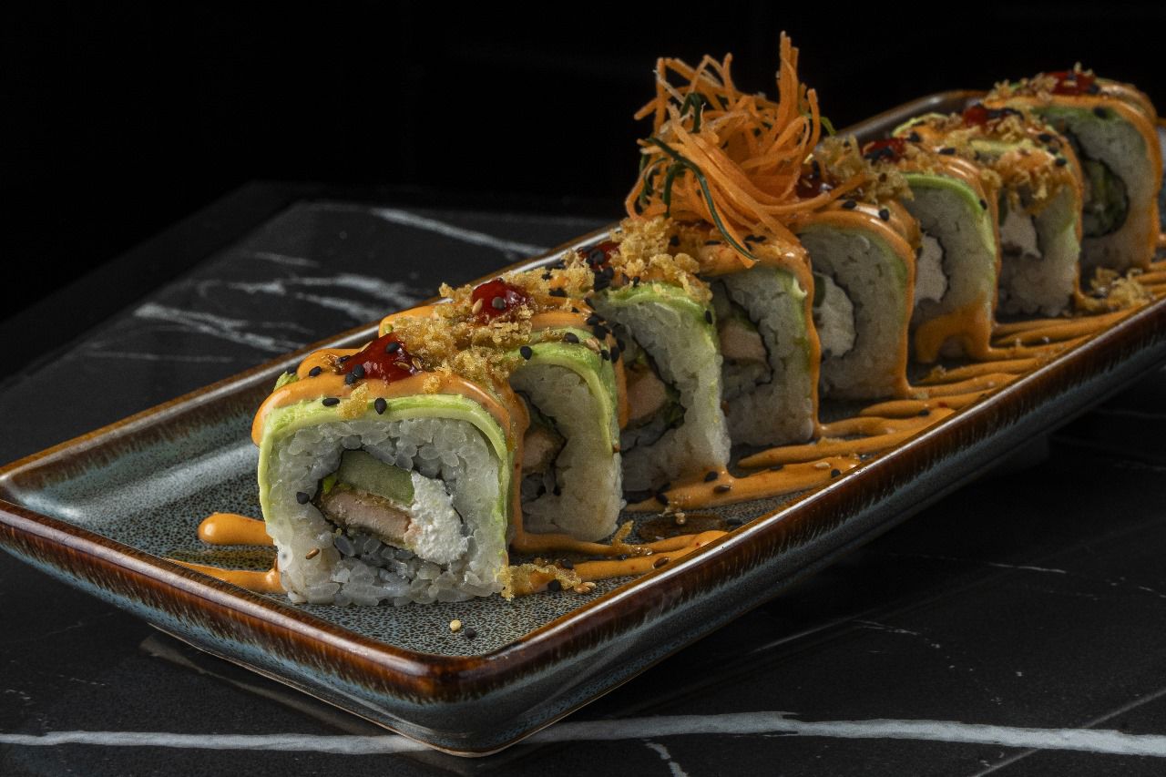 Arroz marinado, alga, hamachi aderezo de chie serrano tostado, aguacate, queso crema, fritura, salsa de anguila, aderezo, ajonjoli y poro frito.