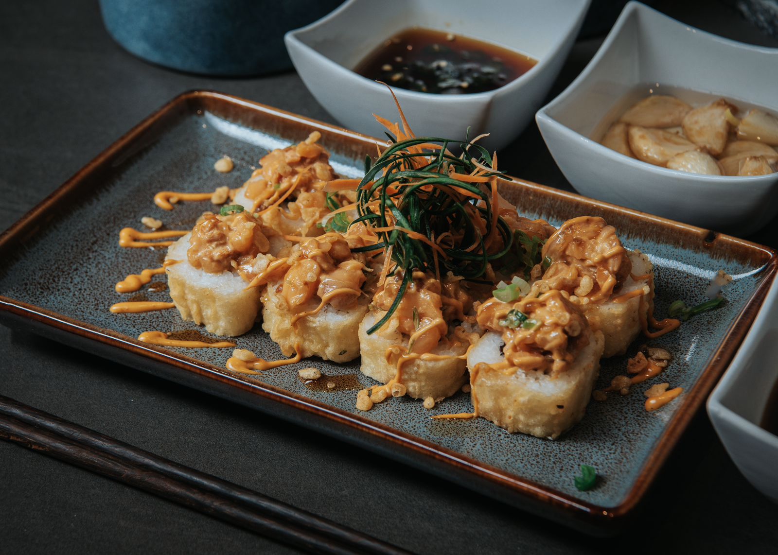 Arroz marinado, cangrejo frito, pasta de kanikama, fritura, ajonjoli, cebollin con siriacha, dorado por fuera, aguacate por dentro, salsa de anguila, aderezo de togarashi.