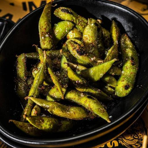 Frijol de soya salteados al wok con aceite de ajonjoli, aderezados con salsa ponzu, togarashi y sal de mar