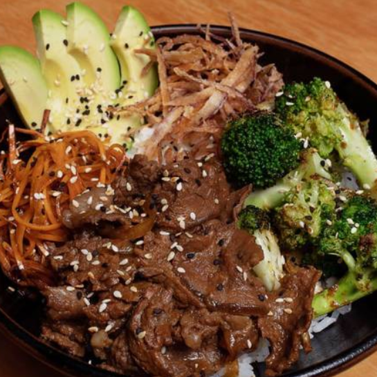 Rib eye en cubitos con salsa gyu don, aguacate, queso crema, cebolla crujiente, zanahoria y brócoli asado.