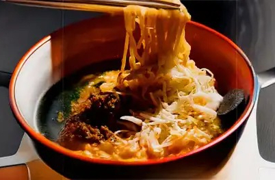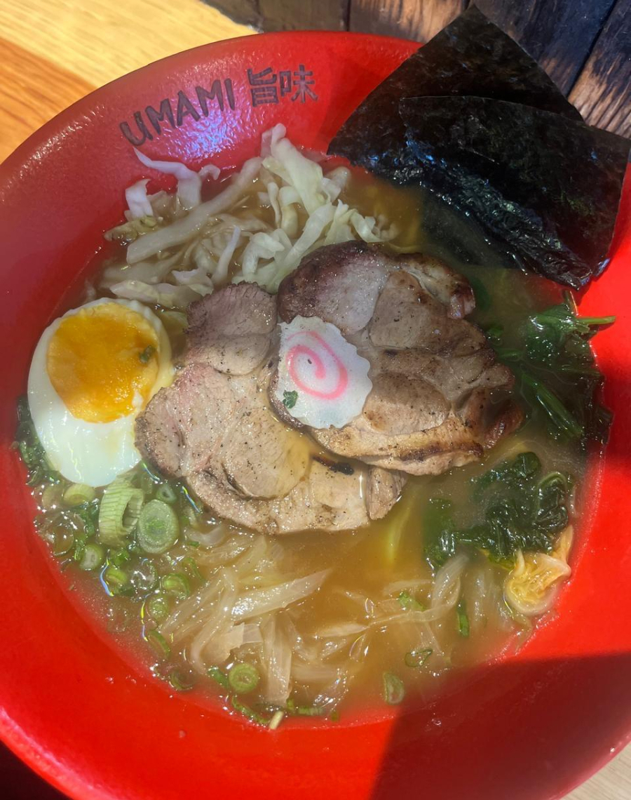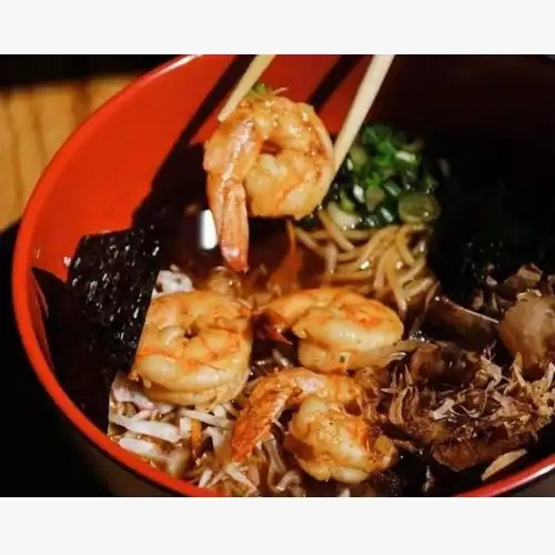 Fondo de pollo y cerdo con salsa rayu (de chiles secos y ajonjolí) , mix de verduras, molida de res y cebollín .