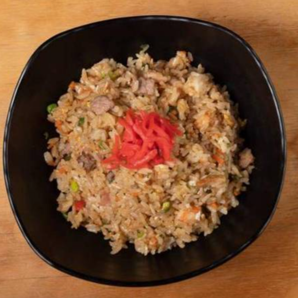 Arroz salteado al wok acompañado de huevo, tocino, carne de res, pollo y camarón, cebollín, zanahoria, un toque de soya y mirin, decorado con jengibre curtido.