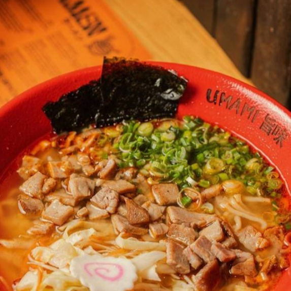 Fondo de cerdo y pollo con pasta miso, lomo de cerdo salteado en pimienta, verduras y un toque de salsa rayu.