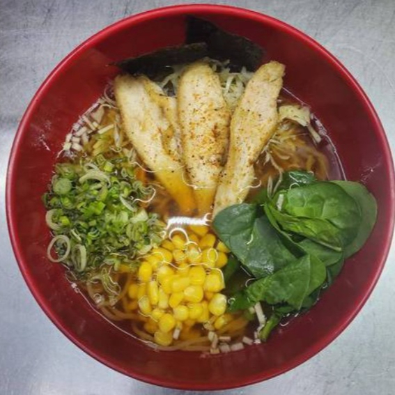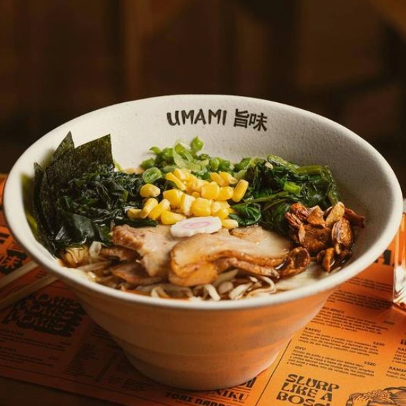 Ramen con fondo de pollo y cerdo, mix de verduras, medallón de lomo de cerdo en salsa chashu, chips de ajo y elote.