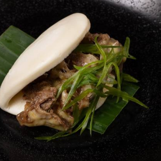 Pan al vapor con rib eye en mantequilla de wasabi con un toque de salsa de soya dulce.