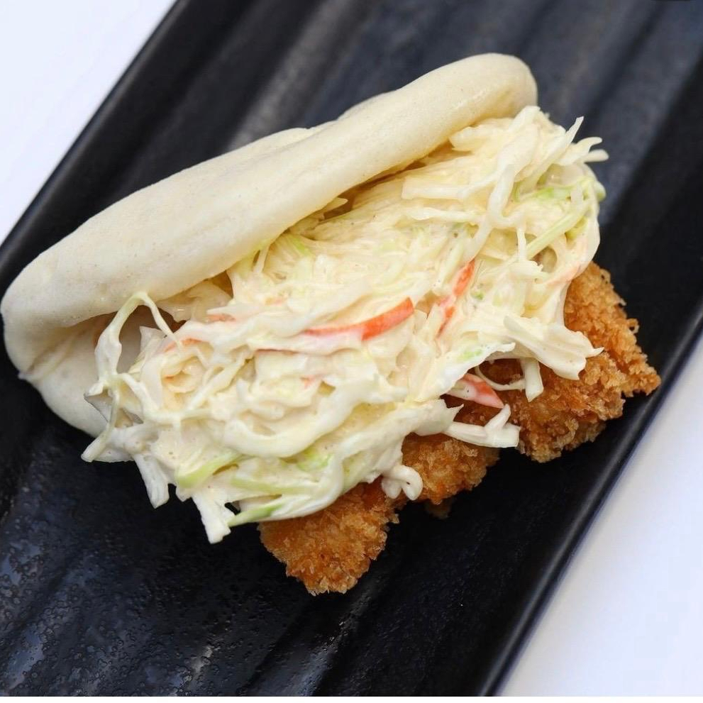 Pollo marinado con manzana, jengibre y ajo, acompañado de mayo spicy, repollo rojo y limón amarillo.