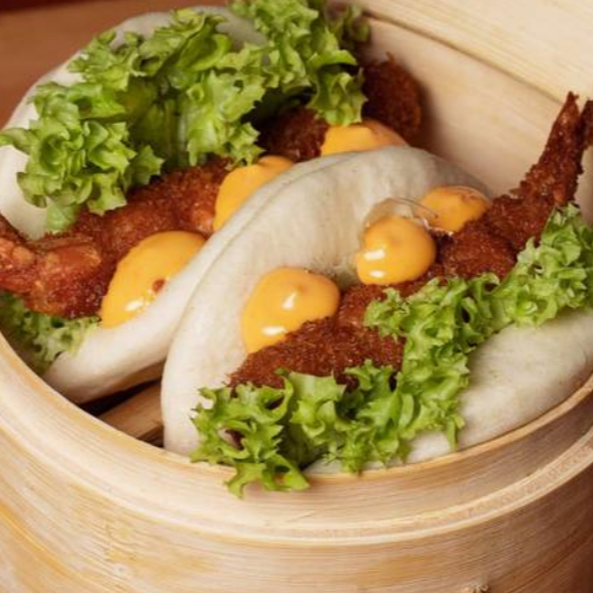Camarón empanizado relleno de queso crema y tocino, lechuga y aderezo de mayonesa spicy.