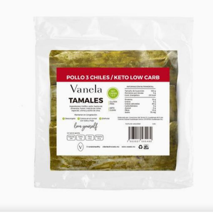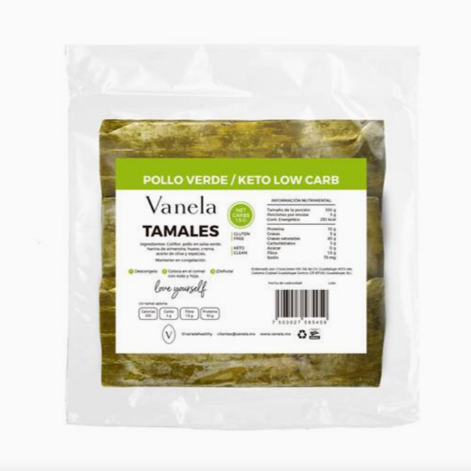 Coliflor, pollo en salsa verde, harina de almendra, huevo, crema, aceite de oliva y especias.