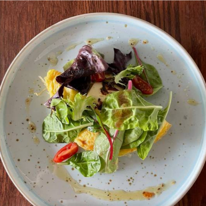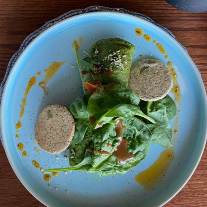 Omelette de espinaca, tomate cherry, queso de cabra y semilla hemp.