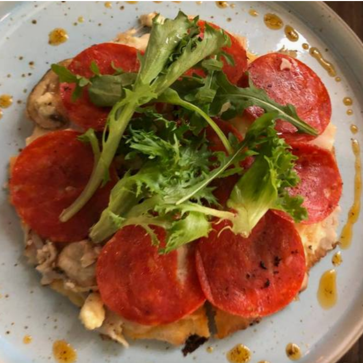 Pepperoni, pechuga de pavo, queso, aceitunas negras, champiñones y tomate cherry.