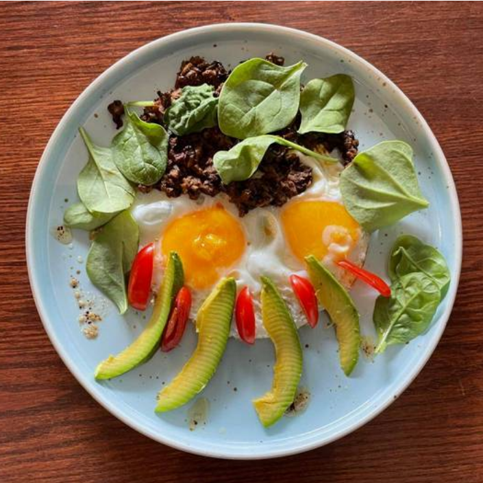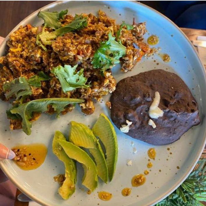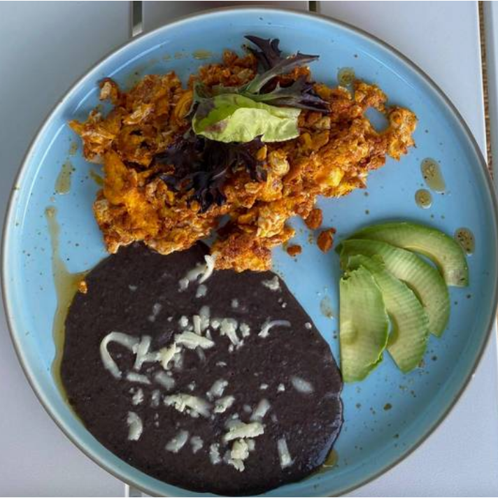 Huevo con chorizo orgánico, acompañado de frijoles y aguacate.