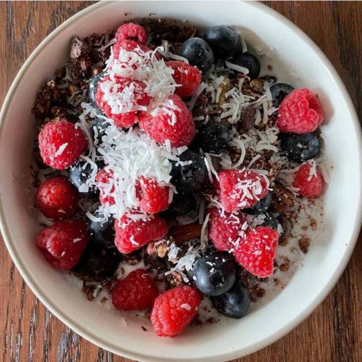 Granola (Matcha o Cacao), frutos rojos, coco rallado, yogurt de coco, kéfir de coco.