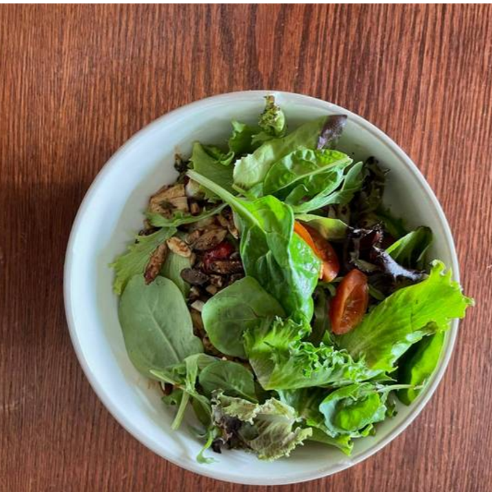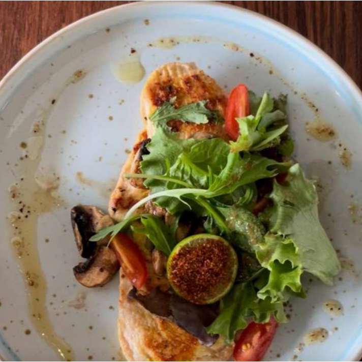 Pechuga de pollo al grill con champiñones, mix de lechuga, tomate cherry y salsa macha.