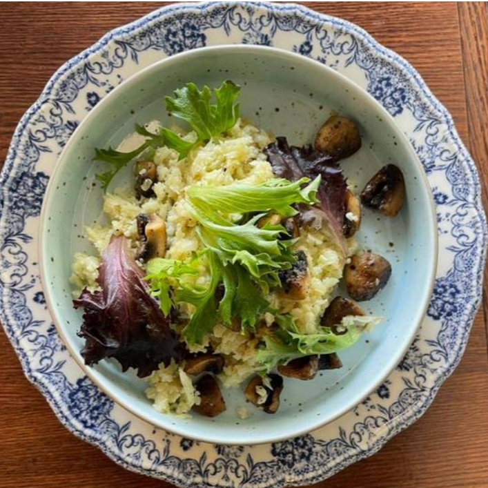 Arroz de coliflor, champiñones, queso Chihuahua y crema.