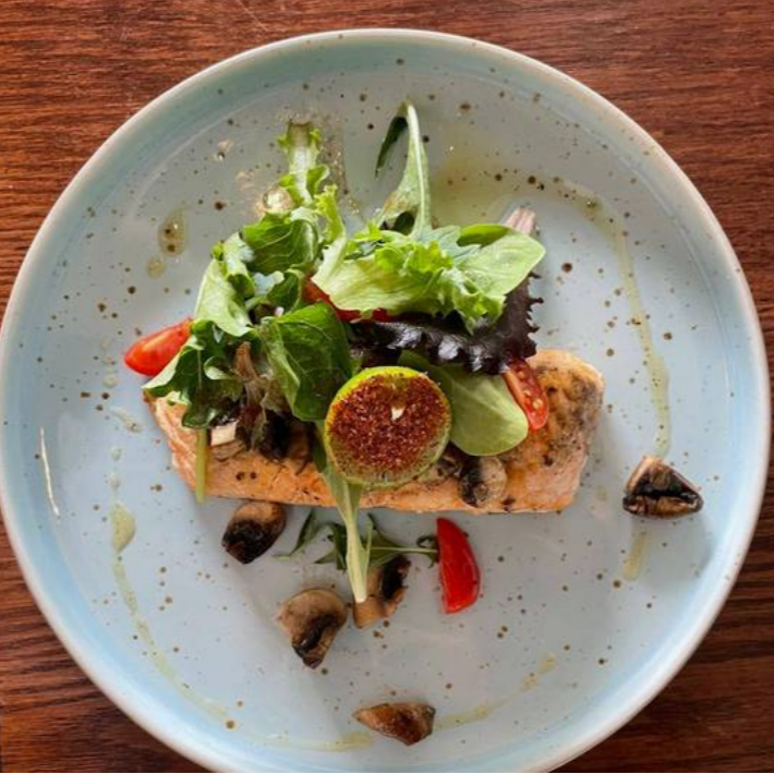 Salmón al grill con champiñones, mix de lechuga, tomate cherry y salsa macha.
