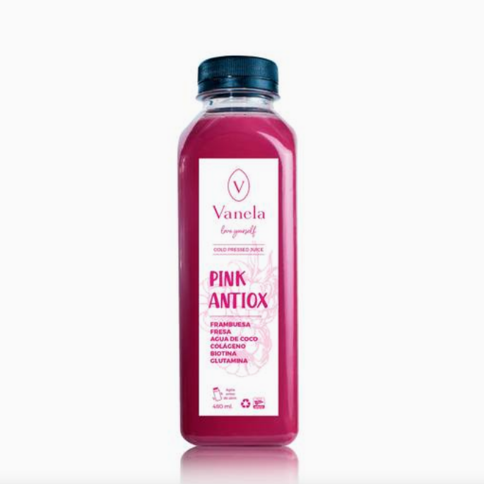 Frambuesa, fresa, agua de coco, colágeno, biotina y glutamina.