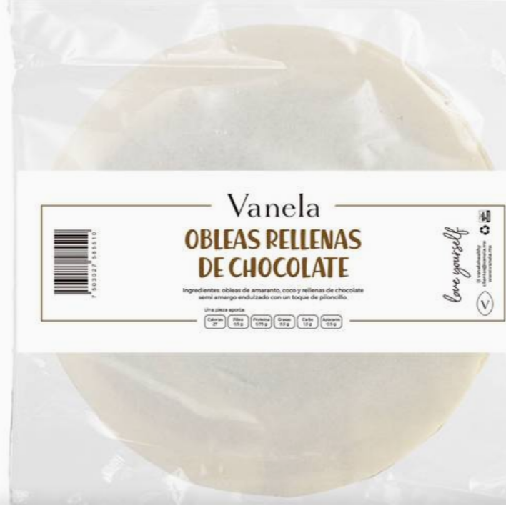 Obleas de amaranto, coco y rellenas de chocolate semi amargo endulzado con un toque de piloncillo.