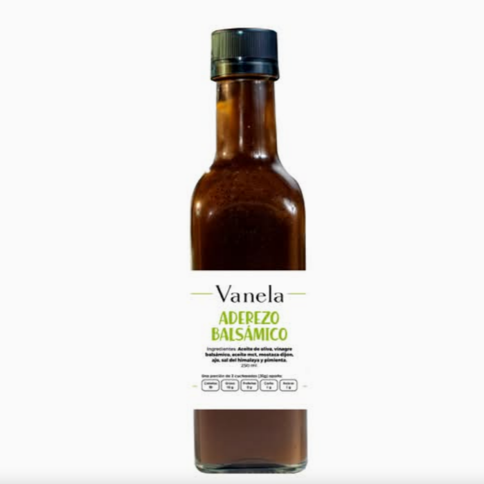 Aceite de oliva, vinagre balsámico, aceite mct, mostaza dijon, ajo, sal del himalaya y pimienta.