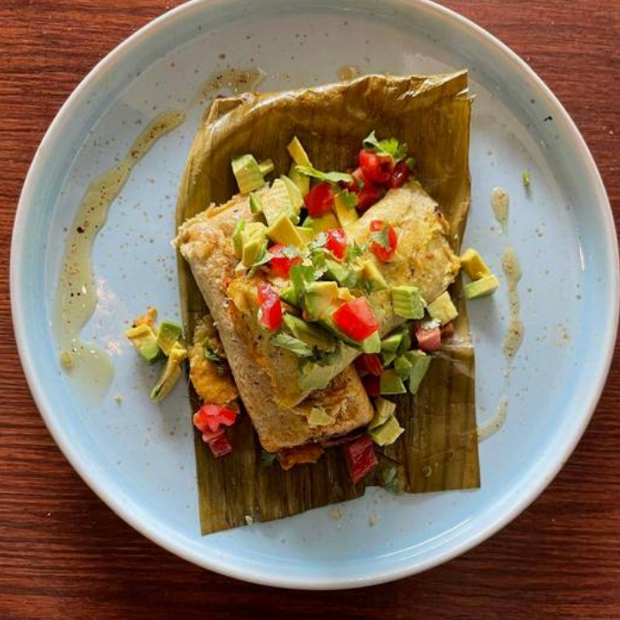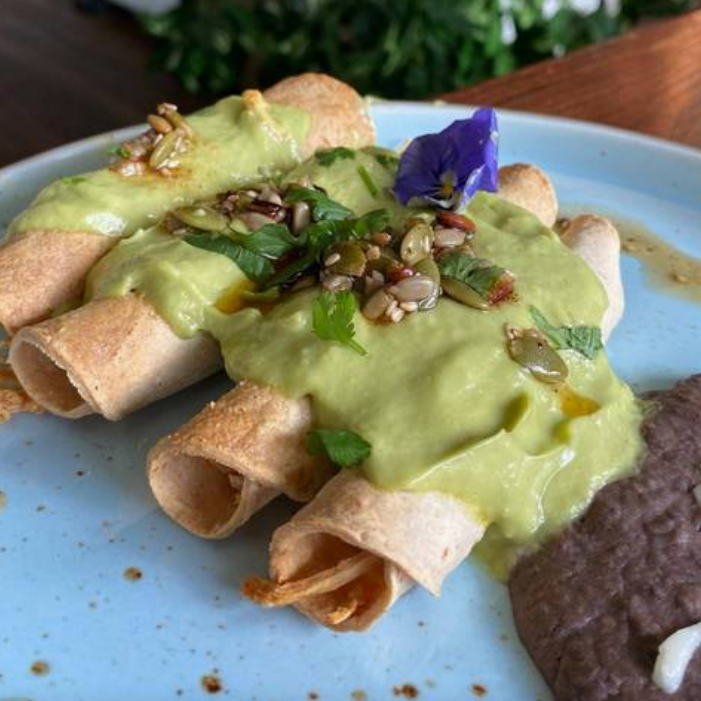Pollo orgánico, salsa verde de aguacate, frijoles y salsa macha.