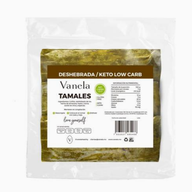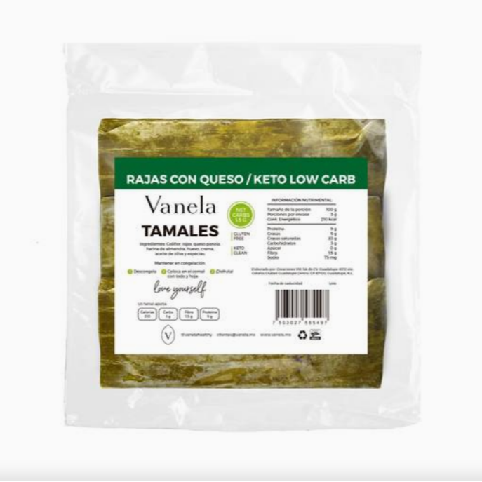 Coliflor, rajas, queso panela, harina de almendra, huevo, crema, aceite de oliva y especias.