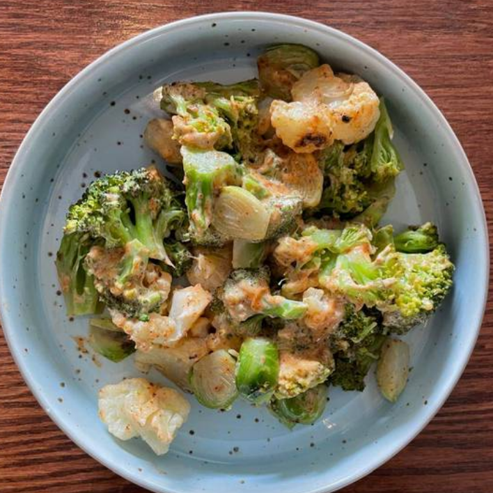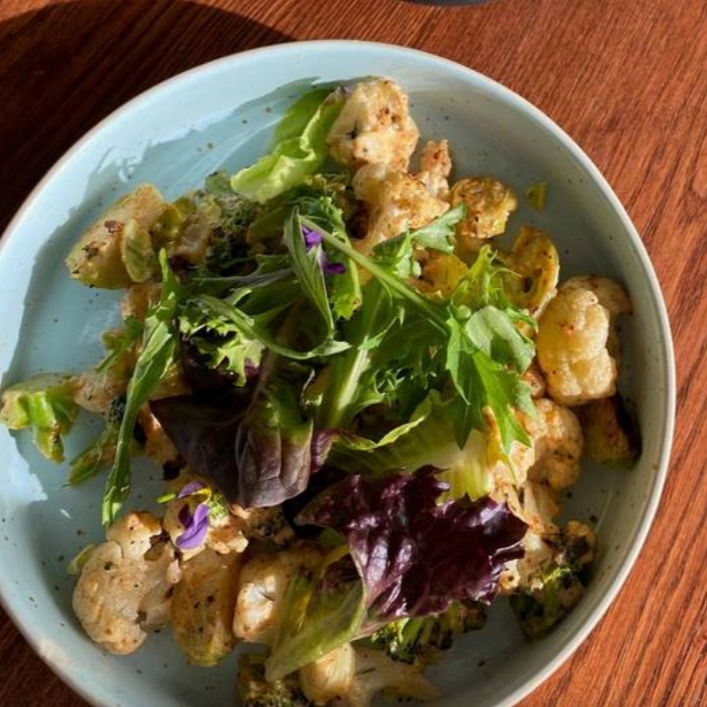 Coles de bruselas, brócoli y coliflor, acompañados con aderezo limonette.