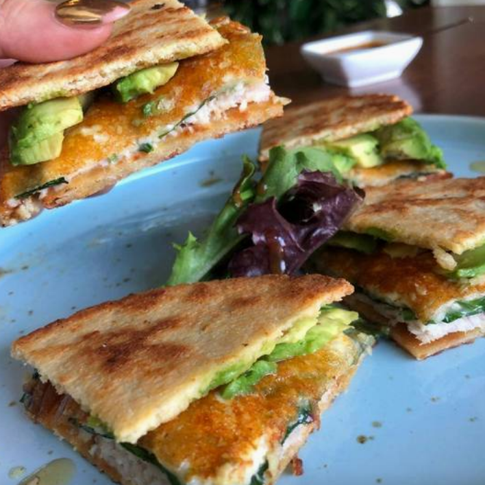 Keto Flat Bread, pechuga de pavo, mezcla de quesos, espinaca y aguacate, acompañado de spicy jocoque.